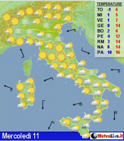 Soleggiato sulla Sardegna e sul Tirreno. Banchi di nebbia o nubi basse nelle vallate interne ed occasionalmente lungo il versante adriatico. Ventilazione praticamente assente, freddo al mattino nelle valli e nelle bassure, molto mite alle quote superiori.