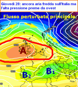 Andiamo dunque per gradi, iniziando dalla situazione di partenza a procedendo poi con i vari passaggi che ci faranno comprendere l’evoluzione sinottica e le conseguenze concrete sul tempo di casa nostra. Mappa numero 2, qui a fianco, riferita alla giornata di giovedì 28 novembre: si nota la lingua depressionaria che ancora si protende dall’est Europeo verso l’Italia apportando freddo e residue condizioni di instabilità sul medio Adriatico e al sud (lettera "B 1").
