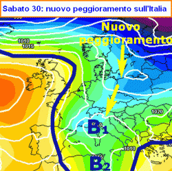 Ecco infatti che nella giornata di sabato (terza mappa qui a fianco) una velocissima saccatura di derivazione nord-atlantica ci piomberà addosso insediandosi con un minimo sui nostri mari di ponente (lettera "B1" della terza mappa). Scaturirà da qui un nuovo peggioramento, che proprio sabato partirà dal nord e vedrà la possibilità di nevicate fin su pianura e fondovalle alpini (generalmente deboli o solo localmente moderate), in particolare sul nord-ovest.