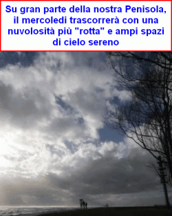 Mercoledì ultime piogge al meridione in via di attenuazione, abbastanza buono altrove, giovedì e venerdì nubi sparse su tutta l'Italia, ma il rischio di pioggia si manterrà generalmente basso, temperature gradevoli di giorno.
