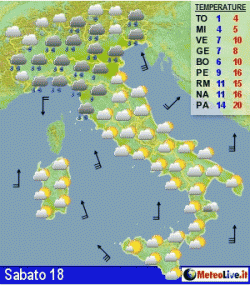 Sabato grigio al nord e sull'alta Toscana, con piogge, schiarite al centro-sud e sulle Isole. Mite per la stagione specie al centro-sud. Domenica piogge estese a gran parte d'Italia con ulteriori apporti nevosi sulle Alpi. Lunedì precipitazioni soprattutto al centro, qualche schiarita al meridione, specie zone estreme.