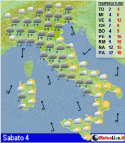 Sabato marcato peggioramento al nord e sull'alta Toscana con piogge e neve sulle Alpi. Domenica tempo ancora compromesso su gran parte d'Italia, con qualche schiarita al nord-ovest in serara. Lunedì ultimi fenomeni al sud e in Adriatico, tempo migliore altrove.