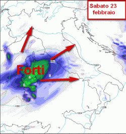 Su Toscana, Umbria occidentale, Lazio e Sardegna occidentale cielo molto nuvoloso, con possibili rovesci o temporali. Nevicate sopra i 400-500 metri su Toscana e Sardegna, 600-700 metri sulle restanti zone, solo localmente a quote inferiori. Più asciutto in Adriatico. Freddo.