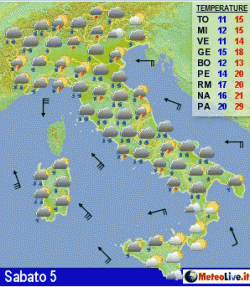 Sabato peggiora al nord e sui settori di ponente, con piogge. Domenica e lunedì generali condizioni di instabilità sulla Penisola, con piogge soprattutto al centro-sud ed in misura minore al nord. Clima fresco e ventoso ovunque.
