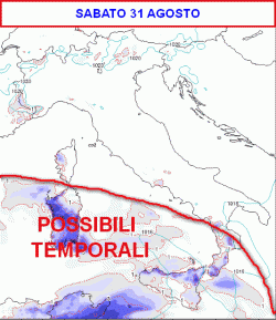 Sulla Sardegna possibilità di temporali, più frequenti sul mare al mattino e nelle zone interne nel pomeriggio. Su tutte le altre regioni tempo stabile e soleggiato a parte nubi nelle zone interne del Lazio nel pomeriggio. Lieve calo termico in Sardegna.