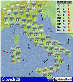 Giovedì ancora tempo molto perturbato su gran parte della Penisola con piogge e vento forte. Venerdì migliora al centro-nord, ancora qualche pioggia al sud. Sabato nuovo peggioramento al nord-ovest con piogge, abbastanza buono il tempo altrove.