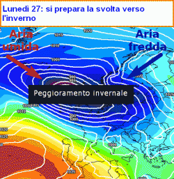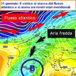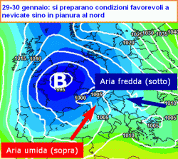 La seconda mappa qui a fianco mostra la manovra cardine, quella che andrà a miscelare l’aria umida in arrivo dall’Atlantico, con quella fredda in arrivo dal nord Europa. Senza l’una o l’altra non sarebbe inverno, non sarebbe neve. E la neve potrebbe arrivare a partire dal 28 gennaio anche a quote molto basse, forse persino in pianura al nord.