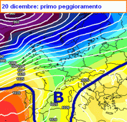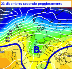 Osservando la mappa qui a fianco, notiamo infatti che tra sabato 21 e domenica 22 si faranno avanti gli avamposti di una seconda perturbazione atlantica, pronta a interessare il nord con nuove precipitazioni. Nubi e piogge si estenderanno a tutta l’Italia il giorno 23 dicembre.