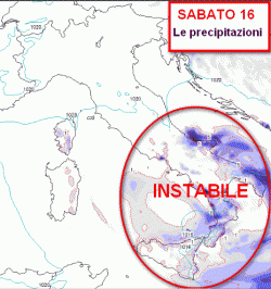 Sabato instabile al meridione e in Abruzzo, con precipitazioni anche nevose in montagna. Abbastanza buono al nord, sulla Sardegna e sul Tirreno. Domenica rientro di correnti orientali sull'Italia, con qualche fiocco di neve sulla fascia prealpina e precipitazioni al sud. Lunedì qualche debole nevicata al mattino sul Piemonte occidentale, precipitazioni al centro-sud, freddo ovunque.
