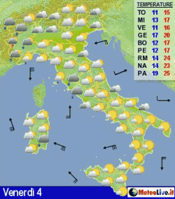 Venerdì generale variabilità, con qualche pioggia possibile al nord e al centro nell'arco della giornata, più sole al sud. Sabato peggiora al nord e sui settori di ponente, con piogge. Domenica maltempo su parte del centro e al sud, migliora al nord, sulla Sardegna e l'alto Tirreno, clima fresco e ventoso ovunque.
