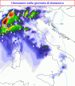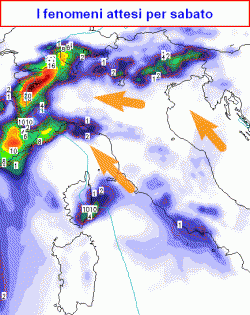 Venerdì tempo perturbato al nord e sulla Toscana, specie sul nord-ovest con piogge intense. Sul resto d'Italia nubi medio-alte senza precipitazioni. Forte scirocco ovunque. Sabato molte nubi al nord e sulle centrali tirreniche con piogge e rovesci soprattutto a ridosso dei rilievi, nuvolaglia irregolare su medio Adriatico e meridione. Domenica perturbata su gran parte del centro-nord, nuvolaglia anche al sud con qualche pioggia sui settori jonici e sulla Campania.