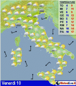 Sulle Alpi, il Friuli e in tendenza anche sulla fascia prealpina ampie schiarite. Su tutte le altre regioni nubi basse anche compatte, con associati banchi di nebbia e locali pioviggini in Emilia-Romagna. Ventilazione quasi assente, clima relativamente freddo.