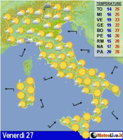 Venerdì bel tempo ovunque, ma con qualche pioggia possibile sull'estremo nord-est. Sabato nubi in aumento al nord, velature al centro, bello e caldo al meridione. Domenica piogge e temporali al nord, in estensione alla Toscana, al Lazio e al nord della Sardegna in giornata, bello e caldo al sud.