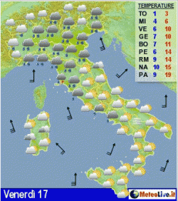Venerdì maltempo al nord e sulle centrali tirreniche, altrove incerto ma asciutto. Sabato grigio al nord e al centro con piogge, in attenuazione su quest'ultimo settore. Schiarite al sud e sulle Isole. Mite, per la stagione specie al centro-sud. Domenica piogge estese a gran parte d'Italia con ulteriori apporti nevosi sulle Alpi.