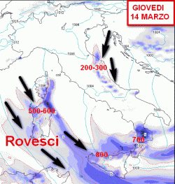 Su tutte le regioni ancora condizioni di tempo instabile, con rovesci anche a sfondo grandinigeno e nevoso sopra i 300 metri su Molise e Puglia Garganica, 700-800 metri altrove. Tendenza ad attenuazione dei fenomeni in giornata sulla Campania. Ventoso e freddo.