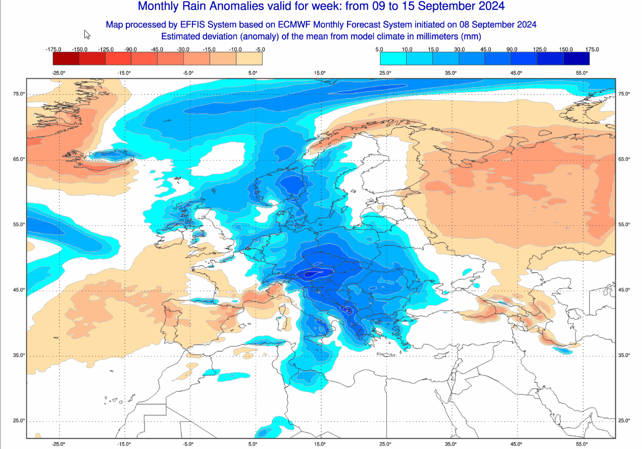 Sul fronte delle piogge, queste sono le anomalie precipitative attese in Italia ed in Europa nel lasso temporale sopra menzionato, ovvero tra il 9 e il 15 settembre: