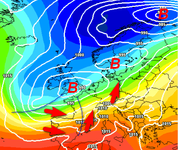 Ricordate la vasta zona di alta pressione che ricopriva gran parte dell’Europa centro-settentrionale fino al termine della settimana scorsa, con massimi in prossimità della Scandinavia? A nemmeno una settimana di distanza, avremo una situazione quasi capovolta, con una complessa area depressionaria autunnale sulle medesime aree, comandata da diversi minimi. L’Italia si troverà nella parte periferica di questa enorme figura di maltempo e verrà interessata da correnti umide e miti tra ovest e sud-ovest apportatrici di nuove piogge.
