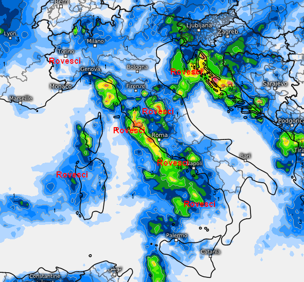 Passiamo adesso al quadro delle piogge attese in Italia nella giornata di giovedi 26 settembre: