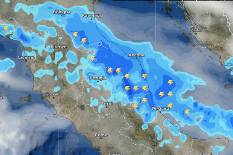 Le conseguenze non mancheranno soprattutto sui versanti adriatici e le zone interne appenniniche in genere, dove già dal mattino sempre seguendo il modello ICON si svilupperanno rovesci a sfondo temporalesco associati ad un calo ulteriore delle temperature, come vediamo qui su base grafica Wetterdienst, da Bologna a Pescara il rischio di rovesci e temporali risulterà alto: