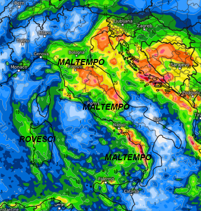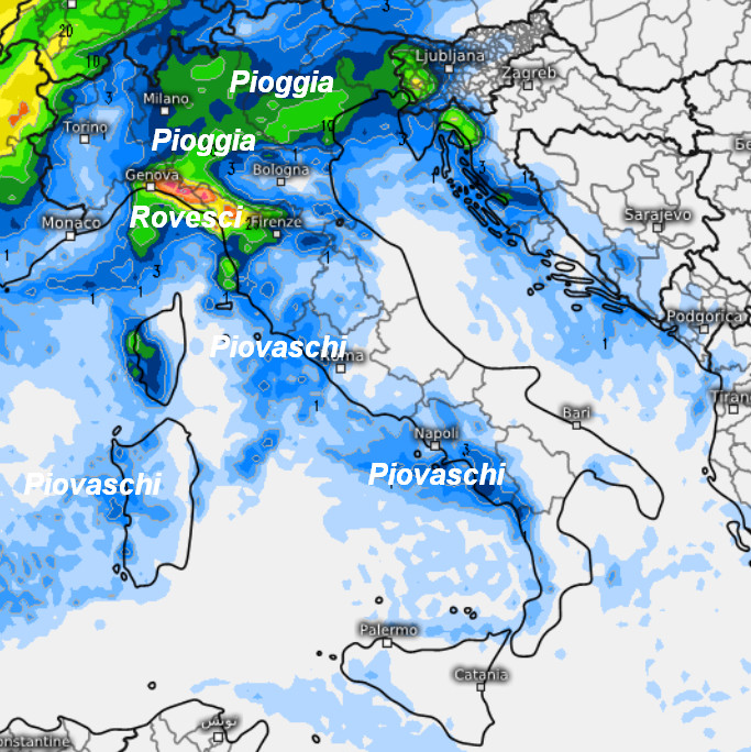 La seconda mappa mostra la sommatoria delle precipitazioni attese in Italia nella giornata di venerdi 20 dicembre: