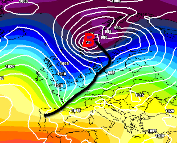 La prima cartina mostra la situazione sinottica attesa in Italia nelle ore centrali di giovedi 19 dicembre: