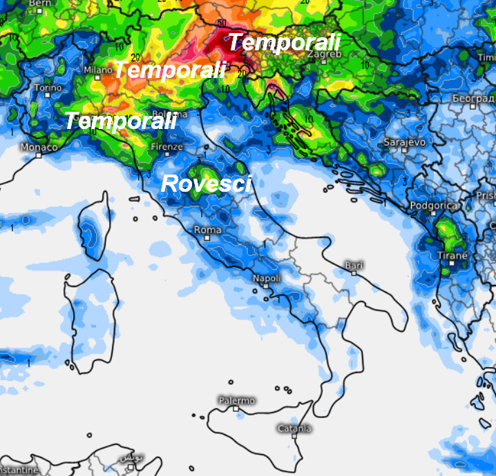 Il tempo migliore lo ritroveremo sulle Isole e all’estremo sud, dove il rischio di rovesci sarà basso. Su tutte le altre regioni ritroveremo un tempo molto instabile con rischio di acquazzoni e temporali sparsi più probabili al nord-est e nelle aree interne dell’Italia centro-meridionale nel pomeriggio, ma con possibili sconfinamenti anche lungo alcuni tratti di costa. Si tratterà comunque di rovesci alternati a pause in parte soleggiate.