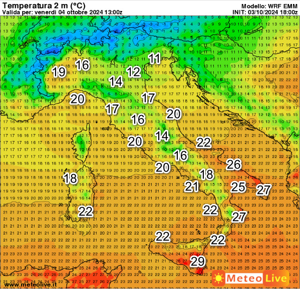 Lieve aumento termico al nord-ovest e temperature invece in calo al nord est e nelle aree interne del centro. Ancora un po’ caldo, ma solo all’estremo sud, con punte di 29° sulla Sicilia meridionale.