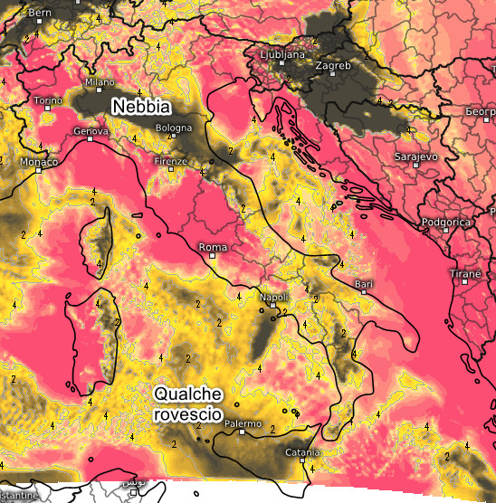 In evidenza ancora la nebbia sulle pianure dell’Italia settentrionale che tenderà temporaneamente ad attenuarsi nel pomeriggio, ma non ovunque. Sul resto d’Italia avremo una nuvolosità sparsa che sulle due Isole Maggiori potrebbe determinare anche qualche pioggia.