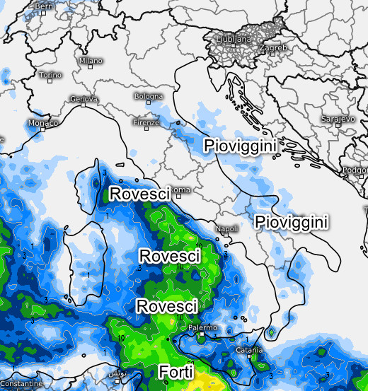 Rovesci e temporali anche INTENSI si svilupperanno nel braccio di mare tra Sardegna, Sicilia e basso Tirreno, interessando parzialmente anche le due Isole Maggiori. Nubi in aumento anche lungo il versante adriatico dove non si escludono occasionali pioviggini; sul resto d’Italia situazione invariata con nebbia sulle pianure del nord e qualità dell’aria pessima nelle città.