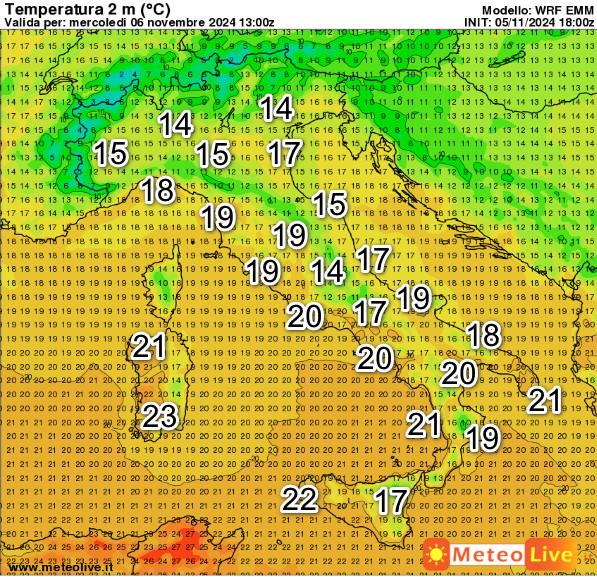 I valori termici non subiranno sostanziali cambiamenti rispetto a ieri. Punte di 23° in Sardegna e 22° in Sicilia. Più freddo in Valpadana sotto le situazioni nebbiose.