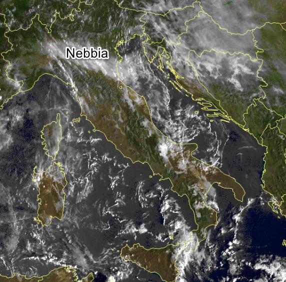 In evidenza la nebbia che grava su molti settori della pianura padana. Abbiamo anche addensamenti sparsi sull’Italia che in prossimità della Sicilia orientale hanno dato luogo anche a qualche pioggia.
