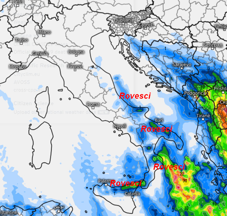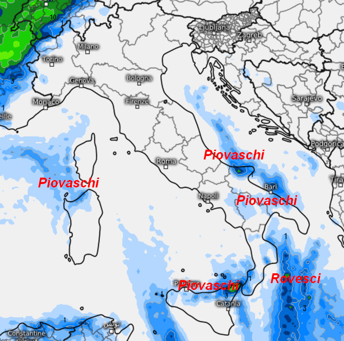 Queste invece sono le piogge attese in Italia nell’arco della giornata di lunedi 2 dicembre: