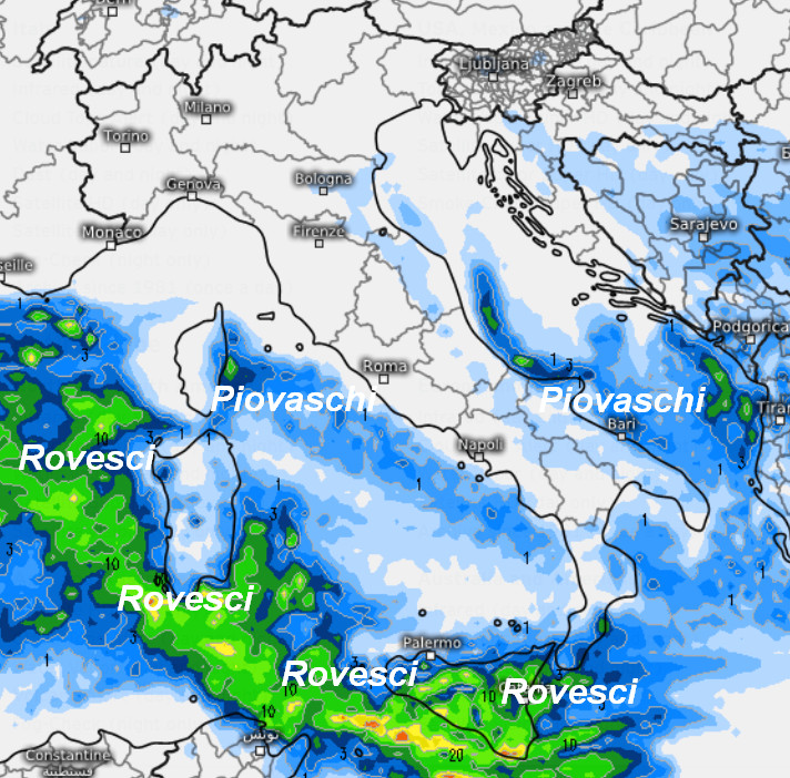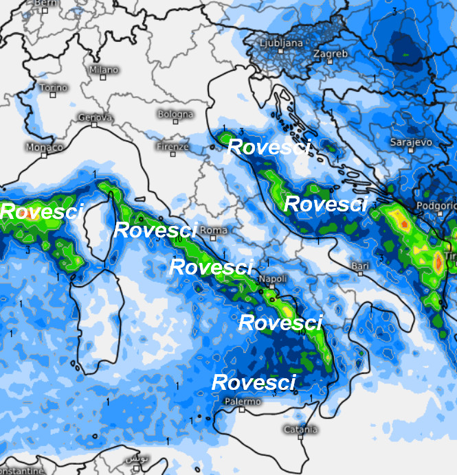 Qualche rovescio insisterà lungo il versante adriatico e sul Tirreno, anche se i fenomeni maggiori dovrebbero essere relegati in mare. Piovaschi anche nel nord della Sicilia e su parte della Sardegna. Al nord tempo asciutto, ma più freddo specie di notte e al primo mattino.