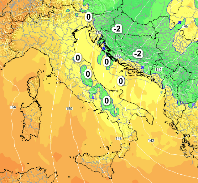 L’apice dell’ondata di freddo che sta interessando la nostra Penisola ci sta toccando proprio in queste ore. La prima cartina mostra le temperature a 1500 metri presenti sulla verticale italica alle ore 8 di venerdi 3 ottobre: