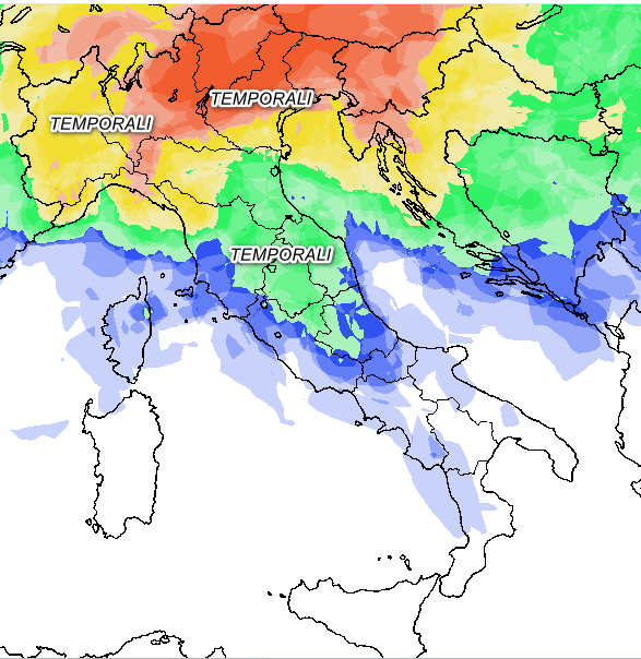 Passiamo adesso alla probabilità di temporali attesa in Italia nelle ore centrali di venerdi 22 agosto – In blu probabilità di pioggia bassa (sotto al 25%), in verde medio-bassa (fra 25 e 50%), in giallo medio-alta (fra 50 e 75%) e in rosso alta o molto alta” (oltre il 75%).