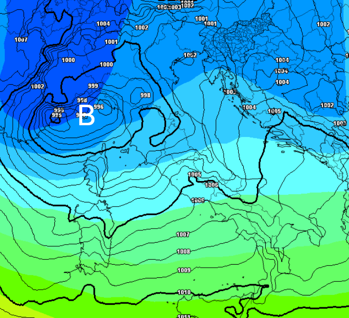 Notate il minimo pressorio sul golfo di Genova, che potrebbe rallentare il passaggio del fronte, favorendo davvero abbondanti nevicate sul settore alpino. Notate anche le isobare molto fitte, che sottendono venti decisamente forti, tipici delle tempeste equinoziali.
