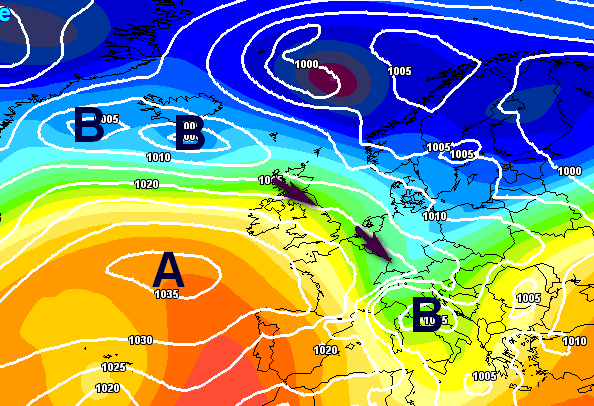 A livello barico la situazione potrebbe essere quella che vi mostriamo qui sotto, con l’alta pressione che si spingerà quanto basta ad est per costringere le correnti ad inserirsi da nord-ovest e lasciando dunque sottovento e senza piogge tutti i versanti tirrenici e nord-occidentali: