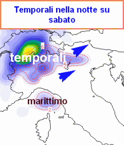 SITUAZIONE: la perturbazione temporalesca presente sulla Francia riuscirà con la sua coda a coinvolgere il nord Italia entro le prime ore di sabato, coadiuvata dalla formazione di un piccolo minimo depressionario al suolo. Essa sarà accompagnata e seguita da aria sensibilmente più fresca, che raggiungerà anche il centro Italia e più marginalmente il meridione.