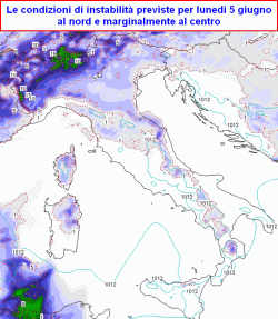 EVOLUZIONE: lunedì una modesta saccatura coinvolgerà il nord e il centro Italia dispensando fenomeni più organizzati al nord, a macchia di leopardo al centro, mentre continuerà ad esserci il sole e a fare caldo al sud.