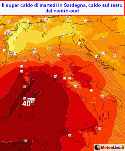 EVOLUZIONE: l’ondata di calore di origine africana tra lunedì e martedì si impossesserà della Sardegna e poi del centro-sud, tentando vanamente di abbracciare anche il settentrione. Da notare che si tratterà di una vampata calda di notevole intensità con punte di 24°C a 1500m dapprima sulla Sardegna, poi su Sicilia, centro