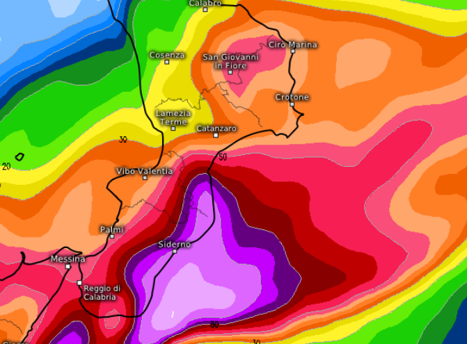 Si vede però molto bene dalla mappa che l’area in viola, con accumuli superiori ai 100mm in poche ore sembrerebbe compresa tra Bianco e Roccella Jonica: