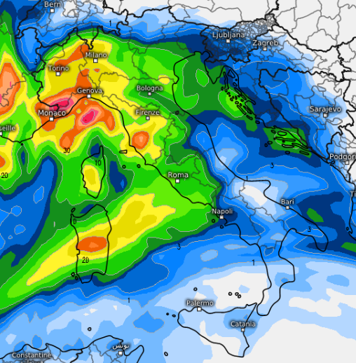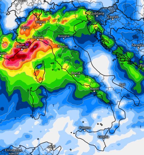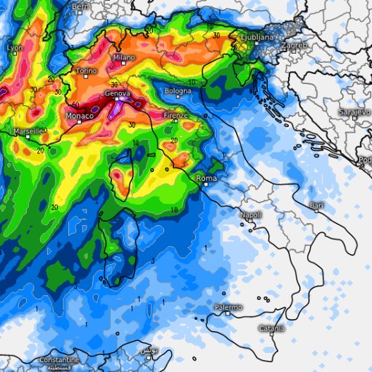 Una ferita depressionaria del genere apre a scenari perturbati molto delicati, con precipitazioni molto abbondanti dapprima sulla Liguria e il nord-ovest, poi anche sull’alta Toscana, già martoriata dai recenti episodi alluvionali.