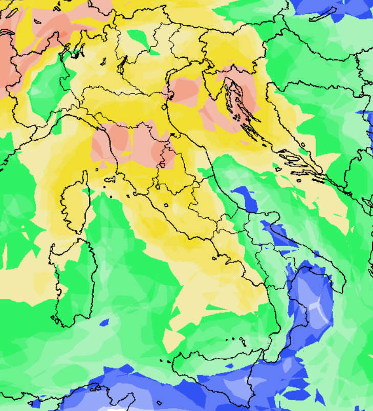 Da questa mappa si evince una probabilità di pioggia MEDIA o ELEVATA praticamente su tutta la Penisola. Una probabilità BASSA si nota solo sulle estreme regioni meridionali ed il settore ionico. La NEVE, secondo gli ultimi aggiornamenti, potrebbe collocarsi solo sulle Alpi a quote di media montagna.
