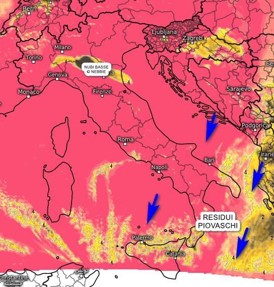 Residui annuvolamenti sulle regioni estreme associati forse a qualche piovasco tra il nord della Sicilia ed il sud della Calabria con un po’ di vento da nord. Su tutte le altre regioni tempo stabile e soleggiato. Presenza di strati nebbiosi o nubi basse tra la pianura emiliana, il basso Veneto ed il sud-est della Lombardia. TEMPERATURE ovunque su valori gradevoli eccetto eventuali situazioni nebbiose.