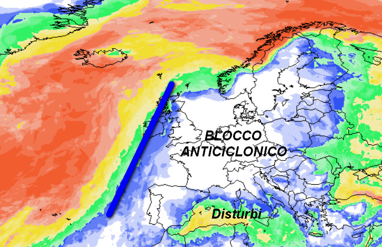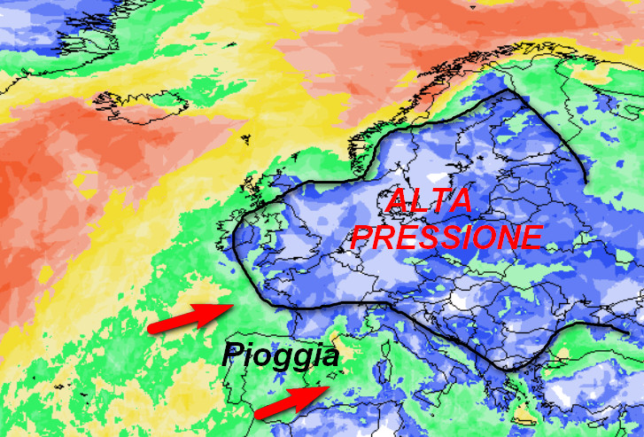 Alta pressione in attenuazione ed in spostamento verso nord-est. Notate le piovose correnti atlantiche che tenteranno di penetrare sul Mediterraneo dall’Iberia, portando un primo cambiamento ad iniziare dal Tirreno e dalla Sardegna.