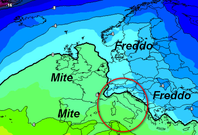 Notiamo valori di poco inferiori allo zero alla medesima quota al nord, con freddo presente sulla parte centro-orientale del nostro Continente; resterà invece più mite il clima sui Paesi dell’Europa occidentale.