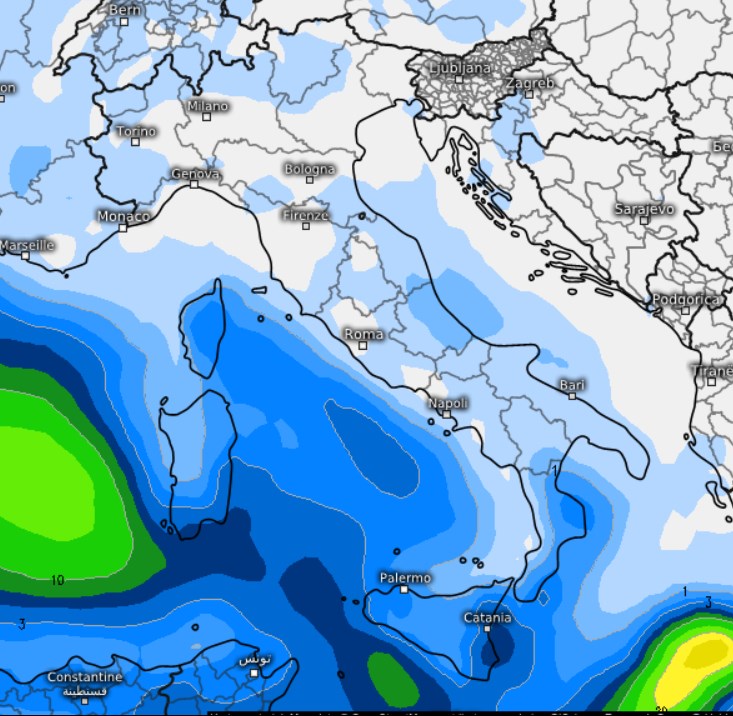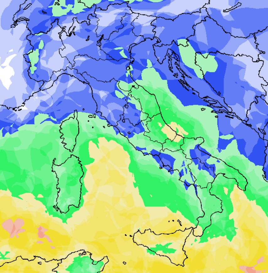 Si nota che le aree con probabilità di pioggia intorno al 60% sono ancora posizionate fra Sardegna e Sicilia: segno, questo, che le piogge non sembrano riuscire ad avanzare con decisione sull’Italia.