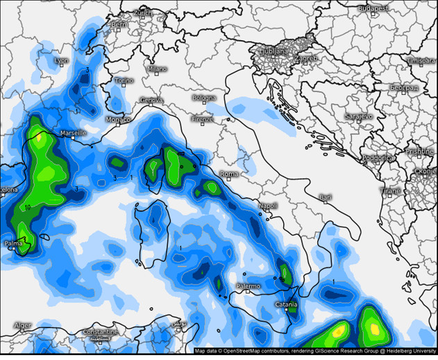 La mappa elaborata dall’intelligenza artificiale ci segnala e conferma che le aree nelle quali potrebbe piovere saranno proprio quelle comprese fra Sardegna e Sicilia, con possibile coinvolgimento della Calabria: