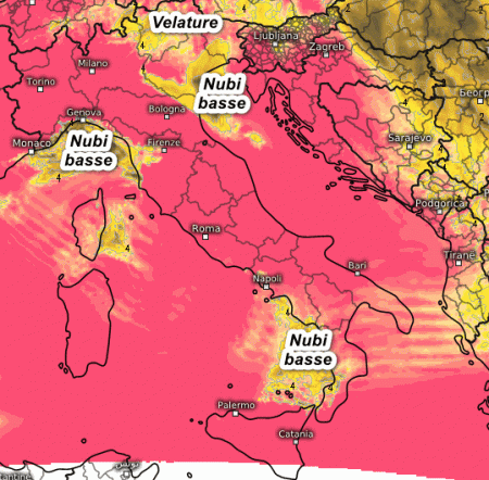 Un po’ di nubi basse saranno presenti sulla Liguria, tra il Veneto e il Friuli unitamente alla Calabria Tirrenica. Su tutte le altre regioni ancora sole implacabile.