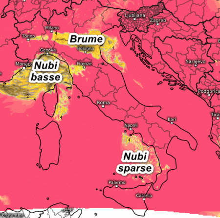 Ancora nessun cambiamento sostanziale: nubi basse sul Golfo Ligure, qualche bruma sulla Pianura Padana orientale e un po’ di nubi sparse sulla Calabria, per il resto cielo spietatamente sereno. Temperature in lieve calo ovunque, ma sempre su valori molto elevati per il periodo.